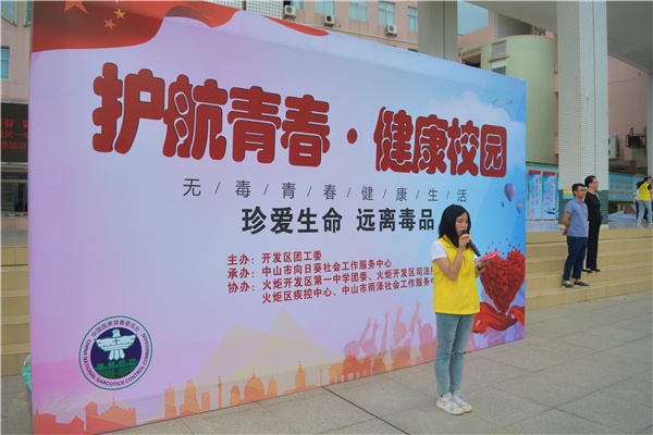 中山市向日葵社工服務(wù)中心社工帶領(lǐng)火炬區(qū)一中學(xué)生志愿者表演完禁毒拍手操后,火炬區(qū)一中團(tuán)委書記張鐵穩(wěn)致辭。他希望同學(xué)們通過下午的游園活動,進(jìn)一步了解毒品的危害,從而珍惜生命、遠(yuǎn)離毒品、擁抱美好人生。他希望大家要認(rèn)真學(xué)習(xí)禁毒知識。增強(qiáng)自覺遠(yuǎn)離毒品意識和抵制毒品的能力;遠(yuǎn)離毒品,遠(yuǎn)離游戲廳、網(wǎng)吧等場所,不接觸毒品,用健康的行為抵御毒品的侵害,做“珍愛生命,拒絕毒品”的好少年;從我做起,抵制毒品,做到不抽煙,不吸食毒品;不從事毒品違法犯罪活動;主動同毒品違法犯罪行為作斗爭。