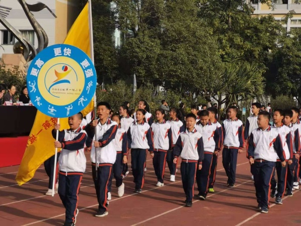 開幕式上,伴隨著鏗鏘有力的《運動員進行曲》,裁判員代表隊、各校運動員代表隊依次入場。第一城小學的運動員們昂首闊步,邁著整齊的步伐,個個精神飽滿、神采奕奕,臉上洋溢著自信的笑容,展現(xiàn)了青少年朝氣蓬勃的精神風貌和“健康向上”的體育精神。