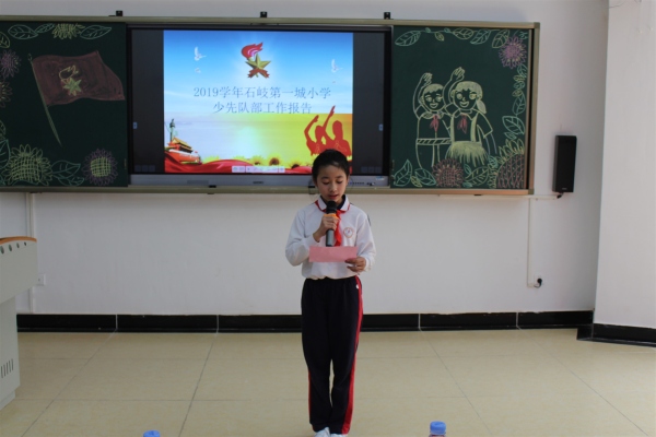 “出隊旗”、“敬隊禮”、“唱隊歌”儀式進行完畢后,進行大會的第一項議程,學校少先隊大隊長洪杰琳隊員向大會作了少先隊工作報告,把學習少先隊2018年一年的工作向在座的代表及嘉賓們做了匯報。