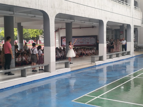 第一項,首先由洪杰琳演唱悅耳動聽的《我和我的祖國》,接著在兩位小主持甜美高亢的聲音中以及莊嚴(yán)的國歌聲中拉來開了序幕,師生們懷著崇高的敬意高高舉起右手,寄托著自己對石岐第一城小學(xué)未來的美好憧憬與祝愿。