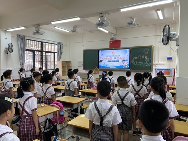 回歸班級(jí),學(xué)生在正副班主任的歡迎聲中走進(jìn)了久違的教室,見到了多日未見的同學(xué)們。第一節(jié)班隊(duì)會(huì)課,吳嬋娟主任組織學(xué)生在教室舉行升旗儀式,同學(xué)們整齊佩戴紅領(lǐng)巾,唱國(guó)歌,向五星紅旗行隊(duì)禮。學(xué)生個(gè)個(gè)高聲唱起國(guó)歌,眼神堅(jiān)定,精神飽滿,用最好的狀態(tài)迎接“開學(xué)第一課”。緊接著,黃榮勝校長(zhǎng)進(jìn)行開學(xué)致辭,題為”健康校園,從我做起”。黃榮勝校長(zhǎng)通過以下幾點(diǎn)進(jìn)行介紹:一、介紹新型冠狀病毒肺炎的相關(guān)常識(shí);二、教導(dǎo)孩子正確的洗手方法;三、為同學(xué)們提供校園防控方法并做了詳細(xì)說明。四、寄語(yǔ)新學(xué)期。最后,由各班班主任對(duì)線上學(xué)習(xí)進(jìn)行小結(jié),了解關(guān)心學(xué)生的學(xué)習(xí)生活,并帶領(lǐng)學(xué)生學(xué)習(xí)一日常規(guī),保證學(xué)生能夠更快適應(yīng)校園生活,更好投入到班級(jí)學(xué)習(xí)中來。