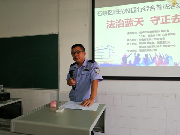 為進(jìn)一步加強(qiáng)禁毒教育工作,提高廣大師生對(duì)毒品危害性的認(rèn)識(shí),促進(jìn)學(xué)生健康安全成長,9月11日下午,石岐高家基小學(xué)開展了“法治藍(lán)天、守正去邪”陽光校園綜合普法活動(dòng)。此次活動(dòng)由石岐區(qū)綜治維穩(wěn)辦、文體教育局等單位聯(lián)合主辦,由中山市社會(huì)工作者協(xié)會(huì)承辦,特邀煙墩派出所陳遠(yuǎn)華副所長擔(dān)任主講嘉賓。