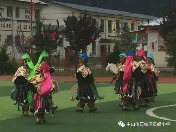 講座后,德瑪校長組織本校的舞蹈隊為中山的老師們表演了精彩的民族舞蹈——梗舞。錯高梗舞被列為自治區(qū)級非物質(zhì)文化遺產(chǎn)重點(diǎn)保護(hù)項目,有著三百多年(一說一千多年)的歷史,是流傳于西藏林芝工布江達(dá)地區(qū)的一種傳統(tǒng)舞蹈,內(nèi)容主要是祈求糧食豐收,保佑身體健康,祝愿家庭幸福等。錯高鄉(xiāng)中心小學(xué)的梗舞小演員們隨著鼓點(diǎn),有時急速旋轉(zhuǎn),有時穿插跑動,有時兩兩斗舞,美麗的民族服飾,靈動的舞蹈動作,贏得了觀眾們一次又一次的掌聲。中山的老師們都忍不住拿出手機(jī)拍照、錄像,希望記錄下這難得一見的表演。表演結(jié)束后,老師們和演員們以及全體同學(xué)們一起合影留念。
