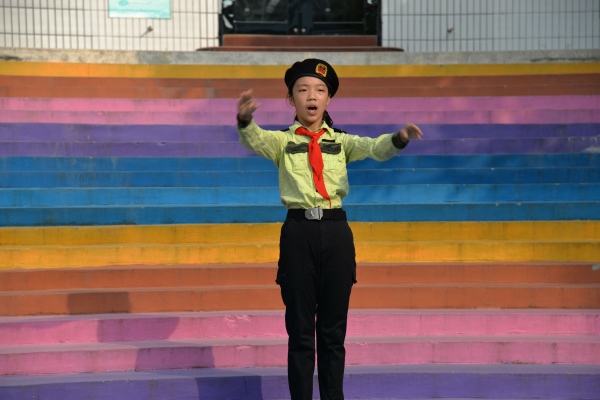 早晨8點,石岐張溪鄭二小學(xué)全體師生在激昂的運動員進行曲下整齊有序地來到操場。全校教師佩戴著鮮艷的紅領(lǐng)巾在升旗臺前面排成整齊的隊伍。一切準(zhǔn)備就緒,升旗手們邁著莊嚴(yán)而整齊的步伐走到旗臺下?!吧龂?,奏唱國歌,敬禮!”全體師生莊重地注視著冉冉升起的國旗,表達著對國旗的無限敬意。隨著雄壯高昂的旋律響起,隊員們高唱隊歌,用嘹亮的歌聲表達著對紅領(lǐng)巾的熱愛,隊員們激情昂揚,朝氣蓬勃。隊旗高高飄揚,星星火炬閃耀著金光,隊鼓鏗鏘而嘹亮,召喚著伙伴響徹四方。隨后,五(2)中隊同學(xué)帶來國旗下講話《中國的生日》,稚嫩的聲音承載著深情的祝福。接著,大隊輔導(dǎo)員周銳鵬老師帶領(lǐng)大家重溫入隊誓詞,在隊旗下莊嚴(yán)宣誓。六(2)中隊同學(xué)帶來詩歌朗誦《我是光榮的少先隊員》,“隊旗飄飄,歌聲嘹亮,我們的心在激蕩,我們的情在流淌,每一塊紅領(lǐng)巾都是用鮮血染成,每一位少先隊員都能沐浴到黨的陽光”,讓同學(xué)們感受到作為少先隊員的光榮和自豪?;顒幼詈?,大隊輔導(dǎo)員周老師帶領(lǐng)隊員呼號:“準(zhǔn)備著,為共產(chǎn)主義事業(yè)而奮斗!”全體隊員高聲回應(yīng)著:“時刻準(zhǔn)備著!”映襯著紅領(lǐng)巾的光輝,每個孩子都精神抖擻,洋溢著自豪的笑容。