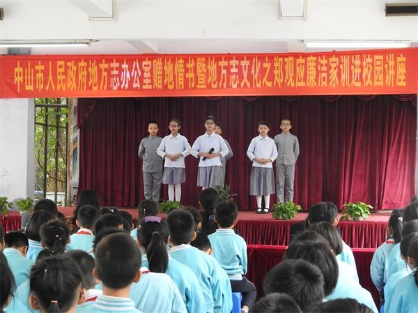 2018年11月28日上午,中山市人民政府地方志辦公室在博愛(ài)小學(xué)舉行中山地方志辦公室地情書(shū)贈(zèng)送儀式暨地方志文化之鄭觀應(yīng)廉潔家訓(xùn)進(jìn)學(xué)校普及講座,中山市地方志辦,市鄭觀應(yīng)文化學(xué)會(huì)長(zhǎng)吳冉彬、副會(huì)長(zhǎng)匡和平,副秘書(shū)長(zhǎng)羅淑怡等領(lǐng)導(dǎo)出席此活動(dòng)。