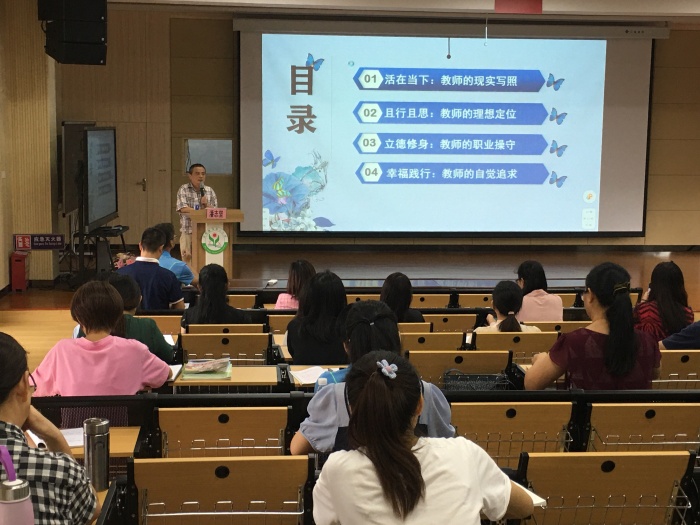 培訓(xùn)主要從四個(gè)方面展開:教師的現(xiàn)實(shí)寫照、理想定位、職業(yè)操守、自覺追求。潘主任語言幽默,他以一組漫畫生動(dòng)介紹了一名教師的忙碌日常,道出了人人稱羨的職業(yè)背后的無奈。接著,他回歸對(duì)教育工作的本質(zhì)的思考,將深刻的道理寓于淺顯易懂的故事中,發(fā)人深省。隨后,潘主任與老師們分享了自己對(duì)“師德”的理解,他說:“師德,拆開來講就是師有理,德有道?!弊鳛榻逃ぷ髡?,應(yīng)該有理想和追求,教師的職業(yè)是具有幸福感的職業(yè),每位老師都應(yīng)該做一名幸福的教育工作者。潘主任也將幸福的法寶告訴了在座的老師們,那就是愛,時(shí)刻心懷愛,用一顆有愛的心對(duì)待身邊的所有人,那么幸福就會(huì)不期而至。