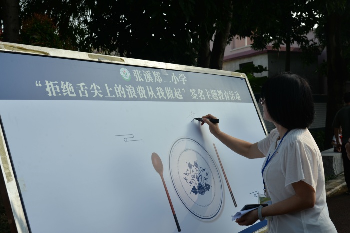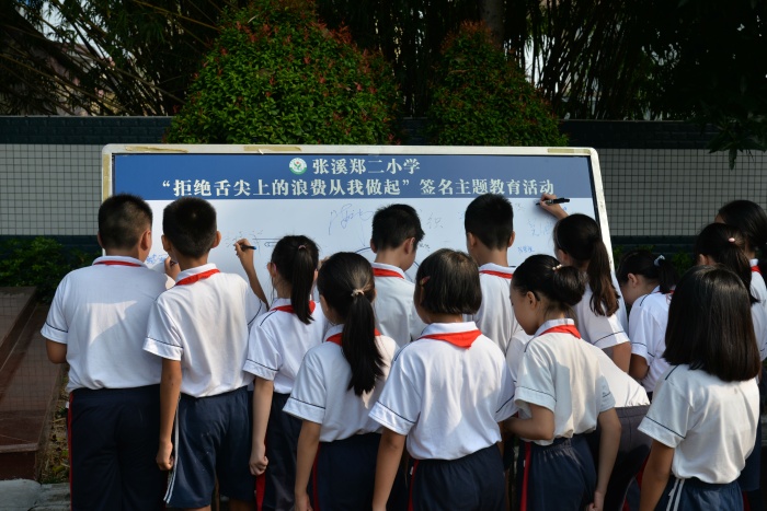 為積極響應(yīng)黨中央的號(hào)召,拒絕舌尖上的浪費(fèi),傳承舌尖上的美德,學(xué)校德育處王太能主任帶領(lǐng)全體學(xué)生宣誓,宣誓結(jié)束后,戴織校長(zhǎng)帶領(lǐng)教師代表和學(xué)生代表在“拒絕舌尖上的浪費(fèi)從我做起”宣傳板上簽名,張溪學(xué)子爭(zhēng)做“光盤(pán)行動(dòng)”的踐行者,爭(zhēng)做節(jié)約糧食的倡導(dǎo)者、行動(dòng)者。