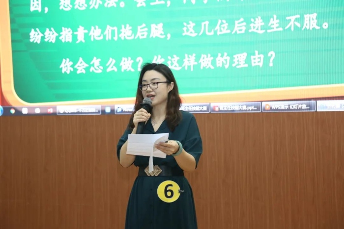 其次進行的是成長故事敘述。選手們講述了一個又一個令人深思的教育故事,讓在場的觀眾明白“懲戒也有藝術”,懂得“把時間還給孩子”的魅力,感受到“一束光”點燃的理想信念......聽著班主任們一個個真實而感人的故事,在場所有老師無不為他們濃濃的愛生之情而感動,被他們閃光的教育智慧所折服,為他們恒久的不懈努力而喝彩。