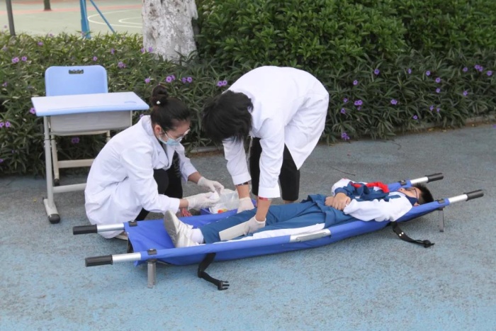 到達(dá)安全區(qū)域后,由各班班主任立刻清點人數(shù)層層上報。按照演練方案,行動組發(fā)現(xiàn)一名學(xué)生“被困” 教室,指揮組組長孫慧濤副校長發(fā)出“請立即組織搜救”的指示,自救隊立即對“受傷被困”學(xué)生進(jìn)行救助。宿舍樓陽臺“冒煙著火”(煙霧彈模擬), 1 名生活老師晃動毛巾“呼救”,行動組組長孫慧濤副校長立即做出行動指示,指定保安人員打開消防栓進(jìn)行滅火、拉好警戒線。同時,報 119 請求支援。消防隊員迅速響應(yīng),駕駛消防車進(jìn)入校園開展救援。同時,“受傷被困”學(xué)生也被成功搜救出來,到醫(yī)療救助點進(jìn)行包扎、檢查。