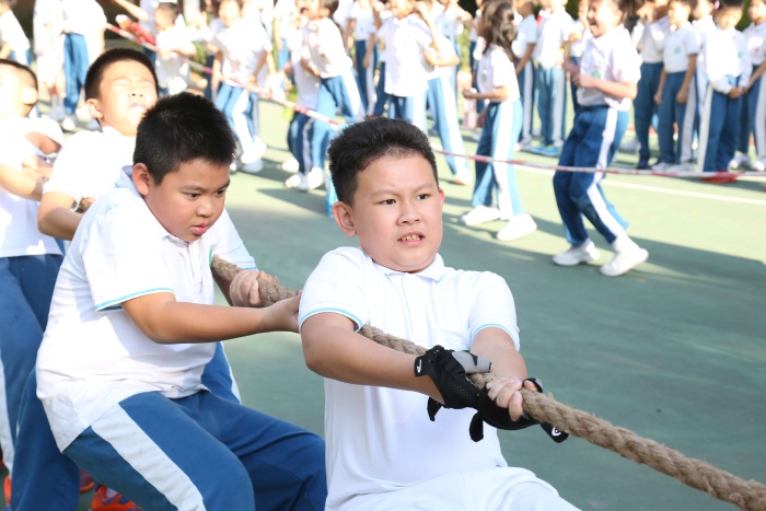 秋高氣爽,陽(yáng)光正好。師生齊聚操場(chǎng),熱切地等待著拔河比賽的開(kāi)始。瞧,孩子們?cè)缫寻崔嗖蛔〖?dòng)的心,個(gè)個(gè)情緒高昂,摩拳擦掌,一場(chǎng)場(chǎng)勢(shì)均力敵的比賽在吶喊聲、加油聲中展開(kāi)?!耙欢佑汀薄耙欢?,加油……”團(tuán)結(jié)拼搏的激情如火焰般染紅了每個(gè)孩子的臉龐;整齊劃一的加油聲如波濤般回蕩在校園內(nèi)。場(chǎng)上運(yùn)動(dòng)健兒生龍活虎,場(chǎng)下拉拉隊(duì)喊聲震天。一根繩,一條心,迸發(fā)的是身體的力量。一班人,一起拼,拉近的是心靈的距離。課堂上我們認(rèn)真聽(tīng)講,賽場(chǎng)上我們也虎虎生威,為了班級(jí)榮譽(yù),每位同學(xué)都拼盡全力!比賽也牽動(dòng)著老師們的心,他們紛紛在旁邊吶喊助威,歡呼聲中,師生融為一體,彼此心貼得更緊。