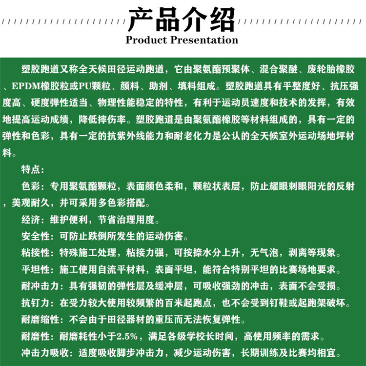 塑膠跑道又稱全天候田徑運動跑道,它由聚氨酯預(yù)聚體、混合聚醚、廢輪胎橡膠、EPDM橡膠?;騊U顆粒、顏料、助劑、填料組成。塑膠跑道具有平整度好、抗壓強度高、硬度彈性適當(dāng)、物理性能的特性,有利于運動員速度和技術(shù)的發(fā)揮,有效地運動成績,摔傷率。塑膠跑道是由聚氨酯橡膠等材料組成的,具有一定的彈性和色彩,具有一定的抗紫外線能力和耐老化力是公認的全天候室外運動場地坪材料。