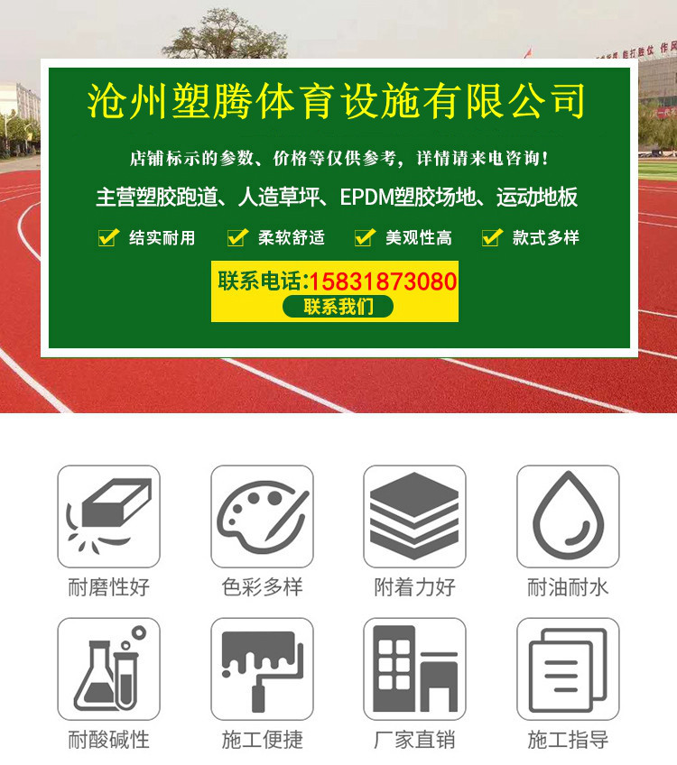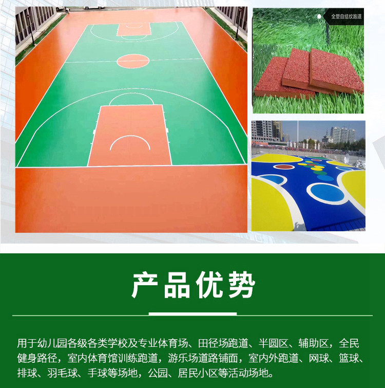 ??我公司擁有先進(jìn)的工藝技術(shù)和機(jī)械加工設(shè)備。專業(yè)生產(chǎn)各種規(guī)格的人工草坪、EPDM彩色橡膠顆粒、膠水等。廣泛應(yīng)用于塑膠跑道、籃球場(chǎng)、足球場(chǎng)、網(wǎng)球場(chǎng)、游泳池、體育場(chǎng)館運(yùn)動(dòng)地面、幼兒園防滑地面等。該產(chǎn)品具有綠色環(huán)保、色澤穩(wěn)定且抗紫外線、耐磨損、彈性好,使用壽命長(zhǎng),易鋪設(shè)保養(yǎng)等優(yōu)點(diǎn)。產(chǎn)品經(jīng)上海和深圳檢測(cè)中心檢測(cè),各項(xiàng)技術(shù)指標(biāo)全部合格,達(dá)到行業(yè)標(biāo)準(zhǔn)。 我們本著以質(zhì)量求生存,以周到的服務(wù)求發(fā)展,熱忱歡迎海內(nèi)外廣大客戶和我們合作,攜手共創(chuàng)輝煌!