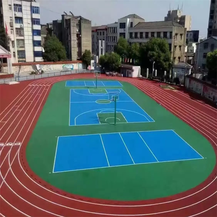 3、機(jī)械噴涂面層1.5mm厚,單組份膠粘劑+EPDM顆粒,再反方向噴涂一遍。