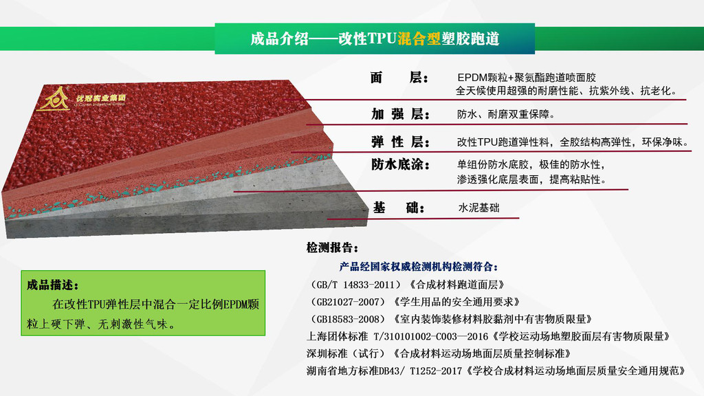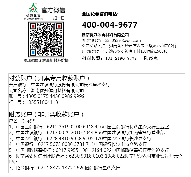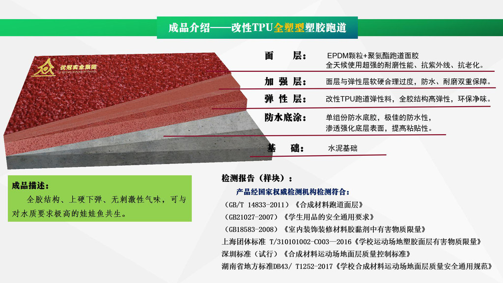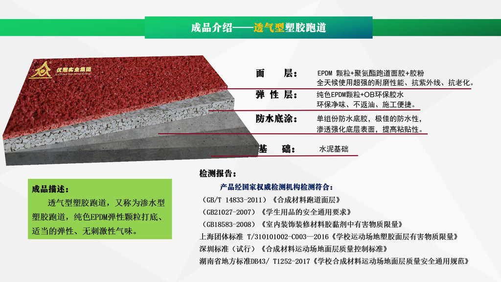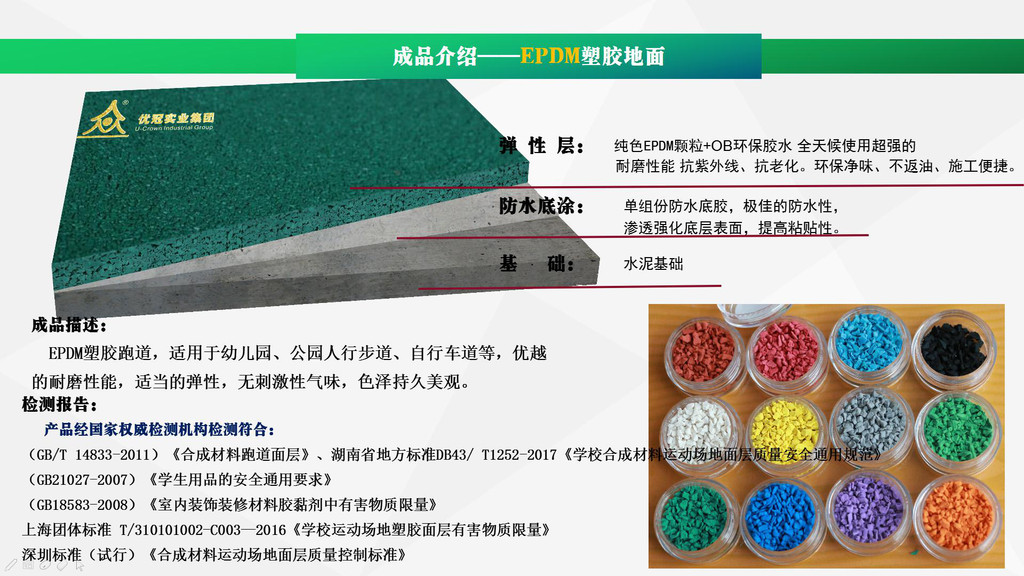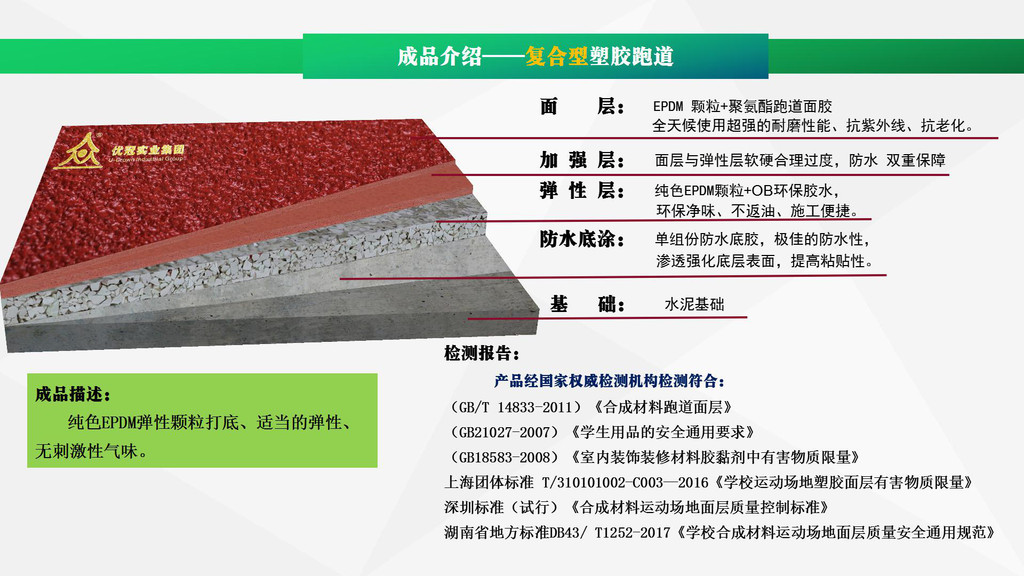 優(yōu)冠實業(yè)集團有限公司(以下簡稱集團)是一家專業(yè)從事運動場地材料,人造草坪研發(fā)、生產(chǎn)、銷售、鋪裝的科技創(chuàng)新型企業(yè),是湖南省地方標準DB43/ T1252-2017《學校合成材料運動場地面層質量安全通用規(guī)范》主要起草單位之一。公司具備國際田聯(lián)(IAAF)認證、國際網(wǎng)聯(lián)(ITF)認證、中國環(huán)境標志產(chǎn)品認證、中國綠色材料標志授權使用證書、企業(yè)生產(chǎn)環(huán)評批復報告、安全生產(chǎn)標準化三級企業(yè)證書、對外貿易經(jīng)營者備案登記表等,并成為湖南省政府采購協(xié)會會員。集團下轄湖南優(yōu)冠體育材料有限公司、五舟體育設備制造有限公司、湖南康普斯人造草坪有限公司、湖南科迪環(huán)??萍加邢薰?、湖南優(yōu)冠運動場鋪裝技術服務有限公司、湖南優(yōu)冠塑膠體育工程有限公司。