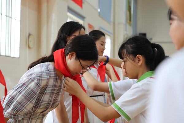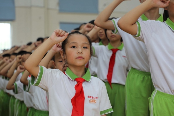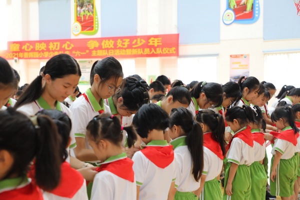 8點(diǎn)40分,學(xué)校籃球館內(nèi)熱鬧非凡,簡單而隆重的 “紅領(lǐng)巾心向黨 爭做新時(shí)代好少年”暨一年級新隊(duì)員入隊(duì)儀式在這里舉行。儀式由六(2)中隊(duì)的幸子越同學(xué)主持?;顒?dòng)伊始,伴隨《出旗曲》,旗手們精神抖擻,邁著正步、高擎隊(duì)旗步入會(huì)場,出旗儀式拉開了活動(dòng)的序幕。隨后,大隊(duì)長王敏喬宣讀一年級被批準(zhǔn)加入中國少年先鋒隊(duì)隊(duì)員名單,祝賀他們成為光榮的少先隊(duì)員。隨著《紅旗飄起來》音樂響起,六年級隊(duì)員為一年級新隊(duì)員佩戴紅領(lǐng)巾,隨即新老少先隊(duì)員互敬隊(duì)禮。接著,少先隊(duì)大隊(duì)輔導(dǎo)員杜沁源老師為各中隊(duì)授旗,隊(duì)員代表為各中隊(duì)輔導(dǎo)員戴上鮮艷的紅領(lǐng)巾,全體隊(duì)員共同高唱《中國少年先鋒隊(duì)隊(duì)歌》,嘹亮的歌聲展示了隊(duì)員們堅(jiān)毅的信心和無比自豪的情感。最后,杜沁源老師帶領(lǐng)隊(duì)員呼號。