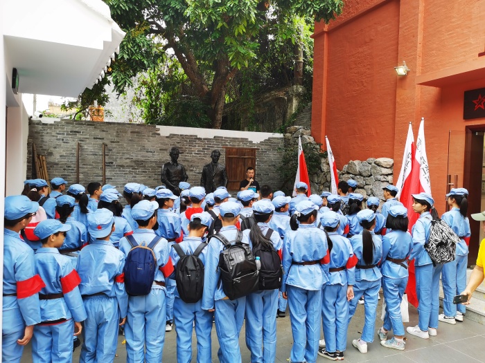 4月25日,天公作美,風和日麗、碧空如洗。中山火炬高技術產(chǎn)業(yè)開發(fā)區(qū)第一小學六年級(4)班在家委的精心組織下,全班51個親子家庭齊聚一堂,出發(fā)前往中山沙溪鎮(zhèn)明亭村參觀申明亭革命史跡館和揚子江故居,開展以“踏尋紅色足跡,共慶建黨100周年”為主題的親子研學活動。