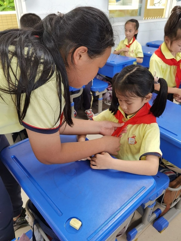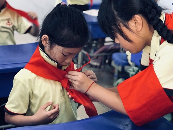大隊(duì)委員們耐心地講解了中國少先隊(duì)組織機(jī)構(gòu)、發(fā)展過程和歷史貢獻(xiàn)。詳細(xì)講解了“六知六會一做”的知識,并且手把手的一年級的弟弟妹妹們敬隊(duì)禮,佩戴紅領(lǐng)巾,學(xué)唱少年先鋒隊(duì)隊(duì)歌,如何宣誓和呼號等,一年級的小同學(xué)們聽的很認(rèn)真,每一雙小眼睛都散發(fā)出渴望成為一名少先隊(duì)員的光芒。