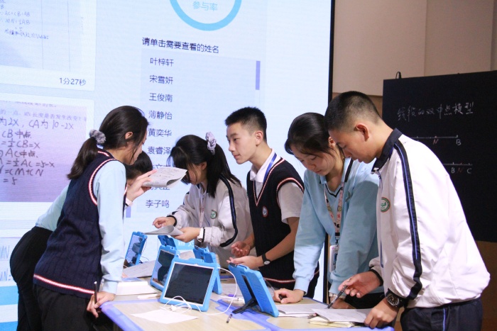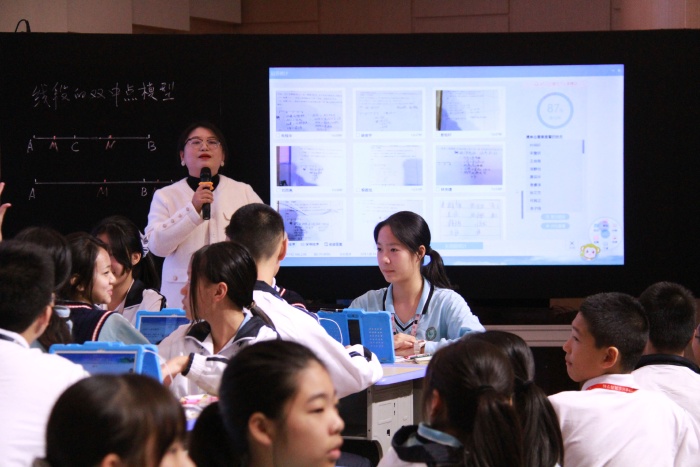 大家移步到一樓報(bào)告廳時(shí),今天一襲白衣,顯得格外溫柔的陳盼老師帶著八班的同學(xué)們已經(jīng)整齊坐好。陳盼老師組織同學(xué)們先用洋蔥學(xué)院進(jìn)行了課前預(yù)習(xí),通過智慧平板在課前進(jìn)行作業(yè)訂正和組內(nèi)答疑,讓學(xué)生對雙中點(diǎn)模型有了初步的印象。課中,使用Geogebra(動(dòng)態(tài)幾何畫板)進(jìn)行展示,幫助學(xué)生了解雙中點(diǎn)模型。陳老師特別注重小組合作,簡單的題或知識點(diǎn)采用小組合作采用對學(xué)的模式,難度較高的則采用群學(xué)的模式,充分發(fā)揮小組的力量。同時(shí)使用智慧教育平臺,學(xué)生通過平板拍照上傳小組探討結(jié)果,老師及時(shí)收集數(shù)據(jù)、反饋答題結(jié)果,據(jù)此組織教學(xué)重點(diǎn)。班上的小小老師,上臺展示時(shí),講解清晰,絲毫不怯場,也讓人眼前一亮!數(shù)學(xué)課其實(shí)也可以有很多互動(dòng),陳老師與八班的孩子們優(yōu)秀地展示了紀(jì)雅的教學(xué)特色:基于智慧教育初中課堂小組合作學(xué)習(xí)”的教育教學(xué)模式。