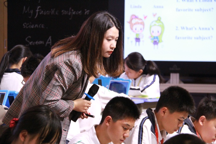 首先初一(7)班同學(xué)們齊聲面對大家先說了自己班級口號。下面的課程中,就不再聽到大家說中文了,真正做到英語課就從一始終用英文來交流。在課前的預(yù)習(xí)任務(wù)中,黎老師使用翼課網(wǎng)布置讀記單詞任務(wù),看誰識記最快。(所有上課任務(wù)都是實(shí)行加分的)上課開始,黎老師展示了學(xué)習(xí)目標(biāo)。而這堂課的內(nèi)容是:我最喜歡的學(xué)科和老師,所以先展示了同學(xué)們熟悉的各任課老師說英語的視頻,并用任課老師生活照片來提示大家用英文說科目名稱,讓學(xué)生一下就能融入學(xué)習(xí)任務(wù)與環(huán)境中。課中使用智慧課堂平臺發(fā)送(聽力)練習(xí)或發(fā)送做題任務(wù),學(xué)生拍照上傳答案,及時(shí)反饋?zhàn)鲱}結(jié)果,提高了課堂練習(xí)的效率。黎老師同樣十分注重小組合作,給學(xué)生創(chuàng)造語境,讓學(xué)生小組交流,兩人對話展示,說說自己最喜歡的科目與老師,以及理由??匆曨l,了解班上其它同學(xué)喜歡哪一位老師與科目。接著以小組合作的形式進(jìn)行語言輸出,互相交流做調(diào)查,并選擇代表展示全組交流結(jié)果。不僅達(dá)到了本節(jié)課教育目標(biāo),同樣體現(xiàn)了學(xué)校特色,為英語課堂的技術(shù)融合提供了經(jīng)驗(yàn)。7班、8班的孩子們在退場時(shí),都能做到安靜、有序、有禮貌,體現(xiàn)了紀(jì)雅學(xué)子的素養(yǎng)。