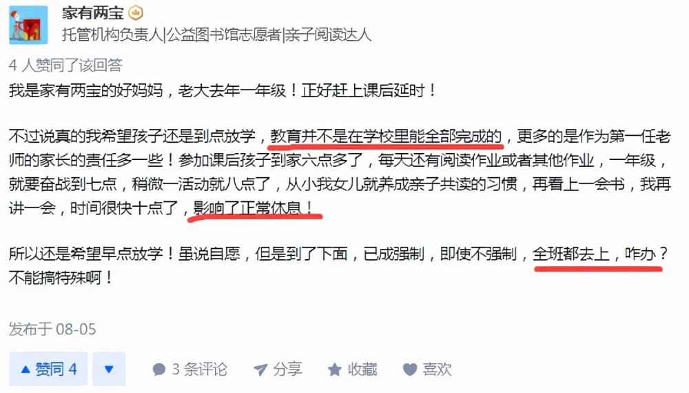 還是有不少小學(xué)生家長對此表示不滿,特別是一年級新生家長,直接拒絕報名課后延時。雖然教育部和學(xué)校已經(jīng)做出詳細部署,可還是有很多問題尚未得到解決。