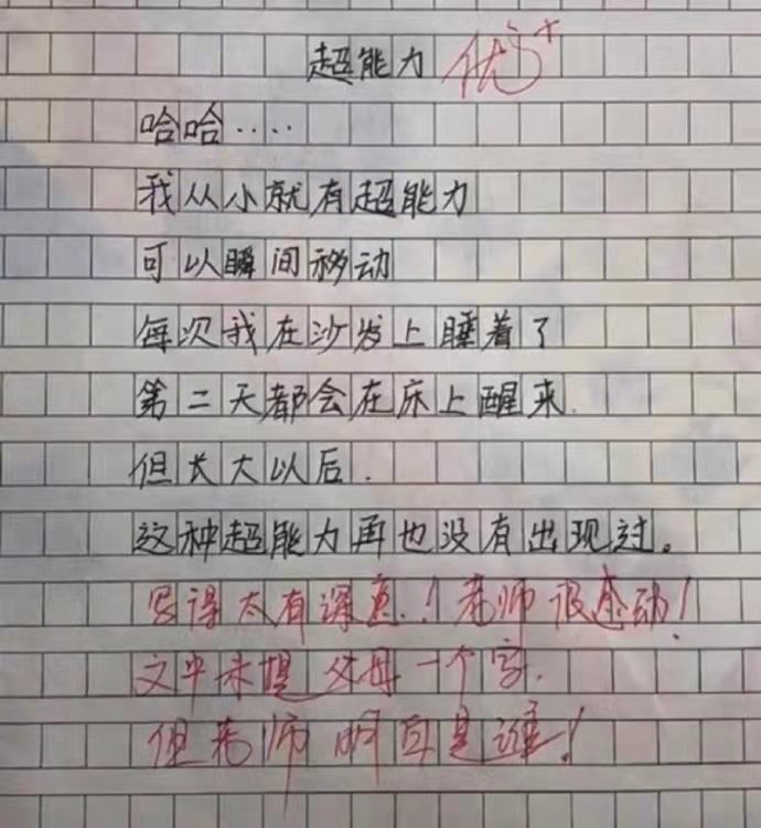 這篇文作文很短,題目是《超能力》,但是內(nèi)容卻在講述和家長對學(xué)生們滿滿的愛意。學(xué)生寫到我從小就有超能力,可以瞬間移動,每一次在沙發(fā)上睡覺,第二天都會在床上醒過來。