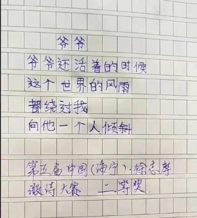 滿分作文《爺爺》,獲得微詩大賽二等獎