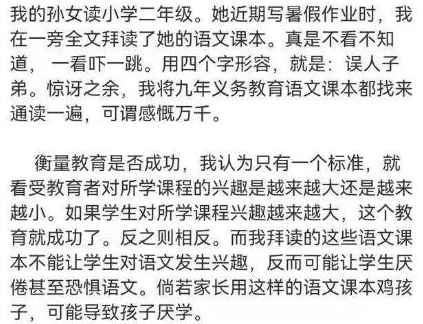 他的孫女上小學二年級,鄭淵潔在輔導孩子寫作業(yè)的時候,看到旁邊的語文課本就提起了興趣拿起來拜讀了一下,這一看不得了,讓鄭淵潔感覺非常吃驚,并且對其用四個字形容“誤人子弟”,隨后他又將9年義務教育的所有語文課本都找來通讀了一遍,然后說出了自己的感慨: