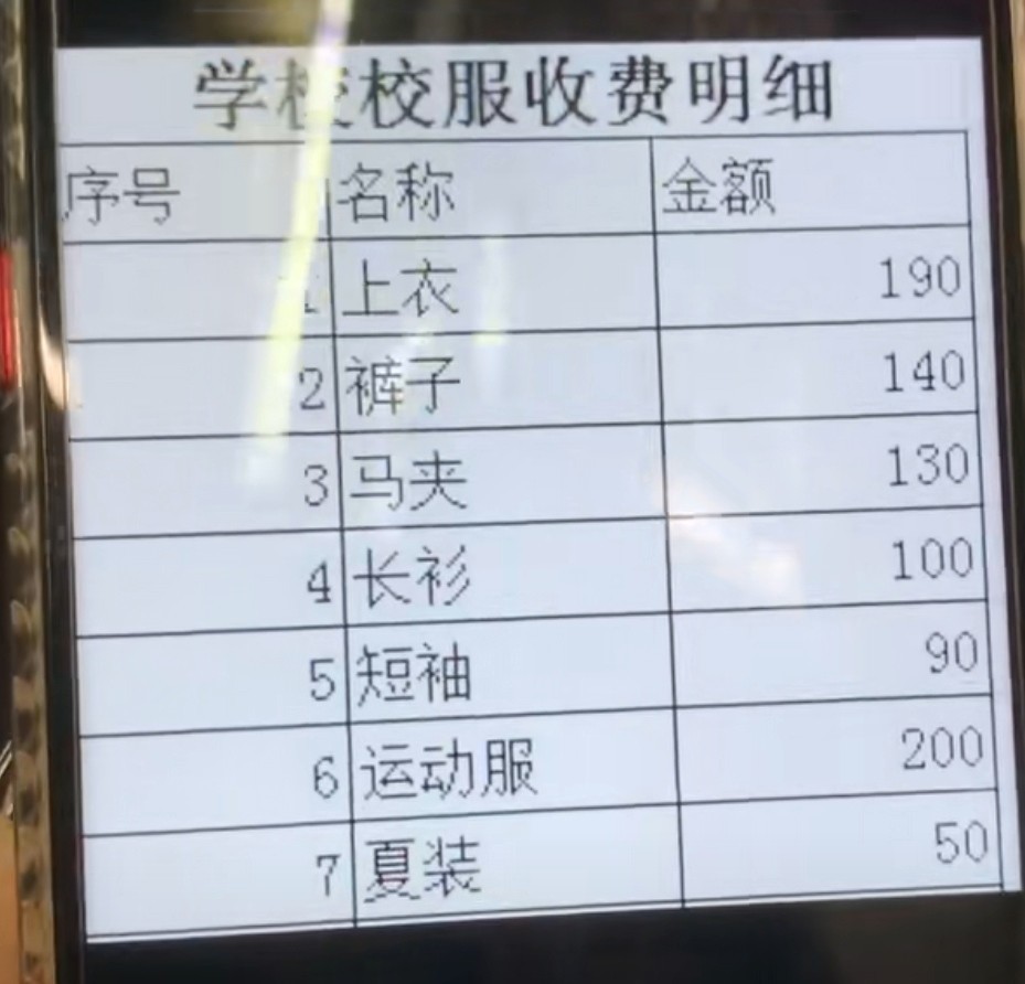 從賬單中可見,學校一次性要給學生訂完一年四季的各種類型校服,加起來有10多件,先不說學生們都能不能用得上,單純這2000元的定價就很夸張了。