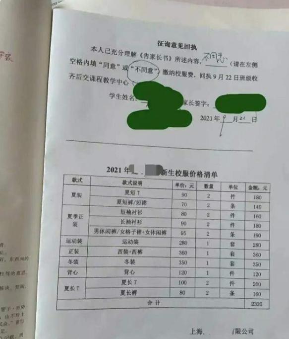 但是上海的一位家長,卻對學校訂購校服的事情并不認同,在孩子帶回來的告家長書上直接簽上了“不同意”三個字,引發(fā)網(wǎng)友熱議。