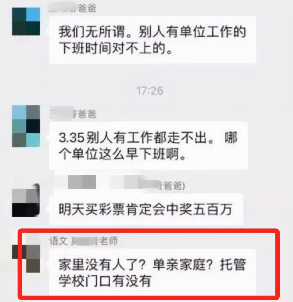 老師的這番話還用了“學(xué)校的意思”當(dāng)借口,自然是得不到家長的認(rèn)同,在被家長反駁后,這位老師又氣急敗壞的,在家長群里說到“家里沒有人了?單親家庭?托管班學(xué)校門口有沒有?”