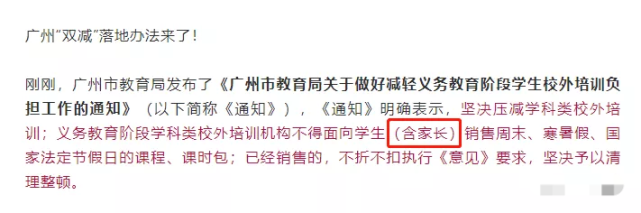 來一起看看廣州雙減關(guān)于這一條的政策:《廣州市教育局關(guān)于做好減輕義務(wù)教育階段學(xué)生校外培訓(xùn)負(fù)擔(dān)工作的通知》明確表示:義務(wù)教育階段學(xué)科類校外培訓(xùn)機(jī)構(gòu)不得面向?qū)W生(含家長)銷售周末、寒暑假、國家法定節(jié)假日的課程、課時包;