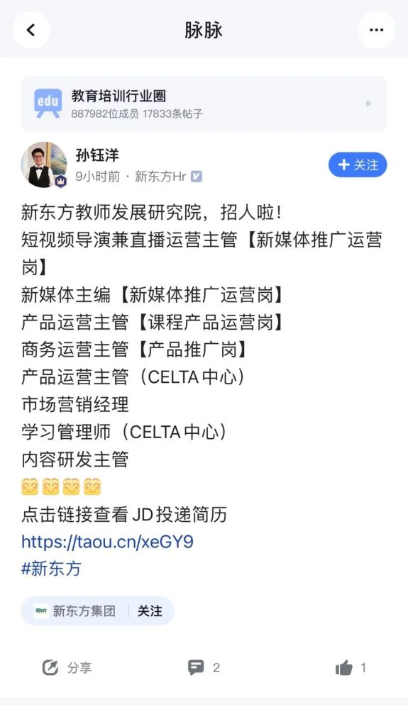 而在職場(chǎng)社交平臺(tái)“脈脈”上,一名認(rèn)證為“新東方HR”的員工在9月24日發(fā)帖,稱(chēng)要招聘“短視頻導(dǎo)演兼直播運(yùn)營(yíng)主管”。