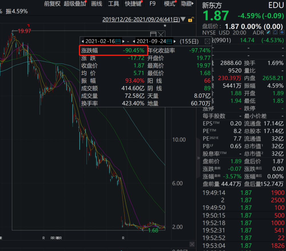 眾所周知,隨著“雙減”落地后,教育培訓(xùn)行業(yè)也經(jīng)歷了一次強(qiáng)烈的地震。不少頭部教培機(jī)構(gòu)的股價(jià)已經(jīng)跌到只剩下零頭。新東方也不例外。wind數(shù)據(jù)i希納是,與近一年最高點(diǎn)相比,新東方的股價(jià)已經(jīng)從19.97美元的高點(diǎn)跌至最新的1.87美元每股,股價(jià)跌去超90%,市值僅剩下32億美元,蒸發(fā)了近2000億元人民幣。