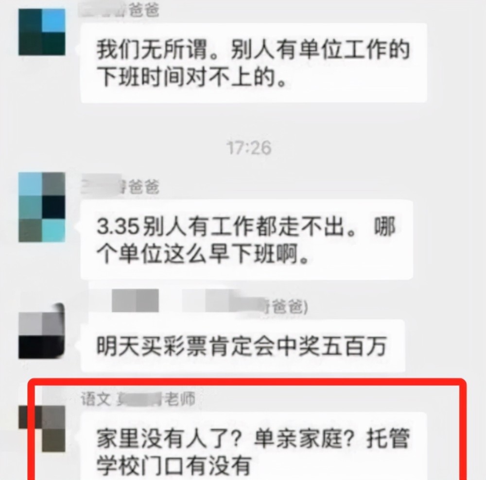 班主任這樣的發(fā)言,也讓很多家長(zhǎng)明白了過來,這就是變相勸退,不想讓孩子上課后延時(shí)班。有家長(zhǎng)表示自己來不及接孩子放學(xué),可能要參加課后延時(shí)服務(wù)。這個(gè)是侯老師開始出言諷刺:“你家沒人了?你單親家庭”?