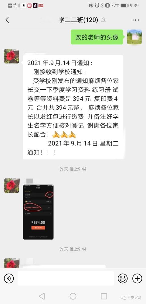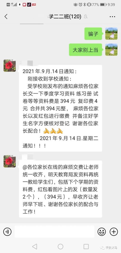 9月14日晚9點39分,在我市某小學(xué)家長微信群里,突然出現(xiàn)了第二個班主任,這位“班主任”發(fā)布了一份以假亂真的學(xué)校通知,要求每位家長以發(fā)紅包備注名字的方式上交學(xué)習(xí)資料費共計394元。只是這位“假班主任”萬萬沒想到,群里的學(xué)生家長中“藏”著真警察。不到一分鐘的時間,騙術(shù)被揭穿,家長群里上演了一幕“教科書式”反詐行動。