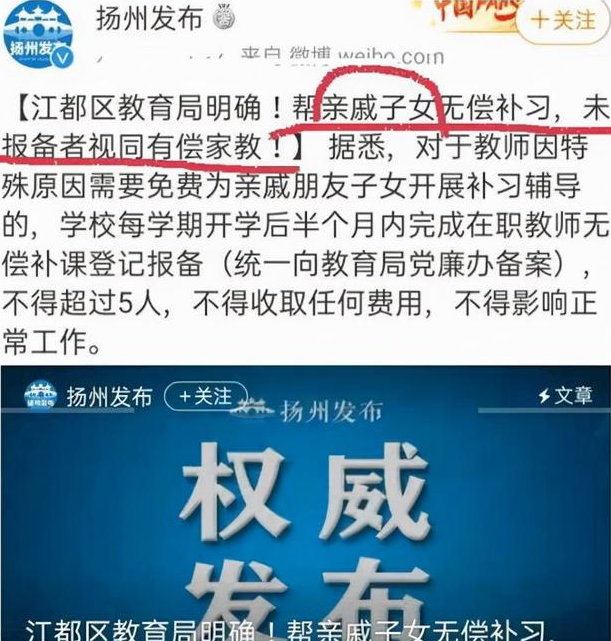 在這一問題出現(xiàn)后,揚州地區(qū)的相關(guān)部門發(fā)布消息,表示教師為親戚子女補課,需提前報備,沒有進行報備的補課活動視為有償家教。如果教師的補課行為被認同為有償家教的話,屬于嚴重違規(guī)現(xiàn)象,教師也可能面臨被辭退。
