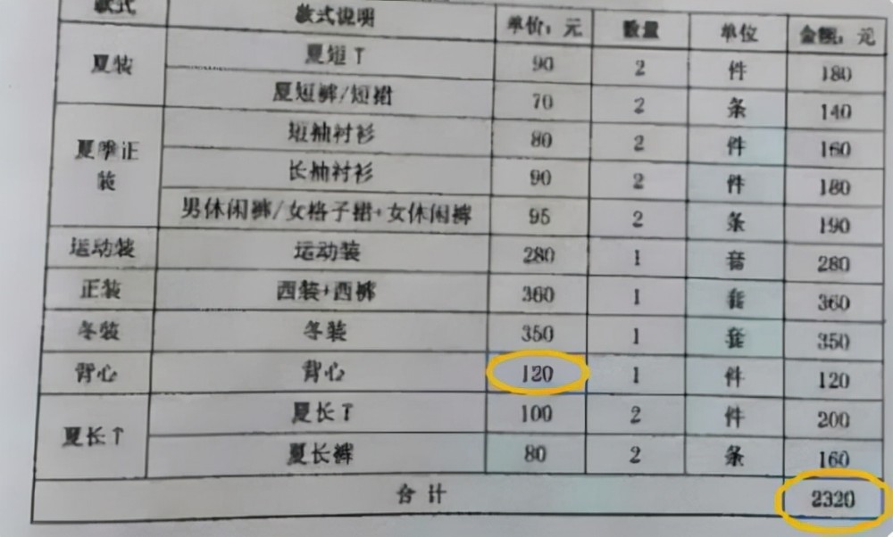 可能是怕小學(xué)生表達(dá)不清楚,學(xué)校特地把校服的明細(xì)打印了出來,從校服繳費單中我們可以看到,大大小小的校服一共18件,最便宜的短裙、短褲是70一件,而最貴的是冬裝,需要350一套,總共加起來是2320元的校服費用。