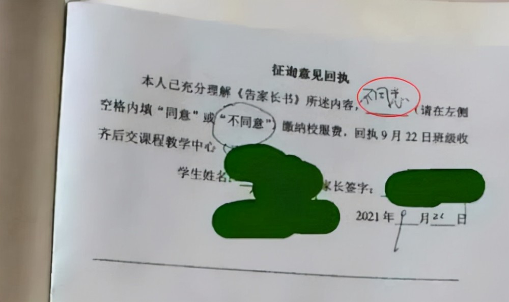 2000多塊,對于上海的普通家庭來說,并不算很多,但是一所普通小學(xué)的校服就要一次性繳納上千元,明顯是超出了很多家長的預(yù)期,于是這位“勇敢”的家長在校服繳費的回執(zhí)單上,霸氣的簽字“不同意”,還特地在單子上把這三個字圈了出來。