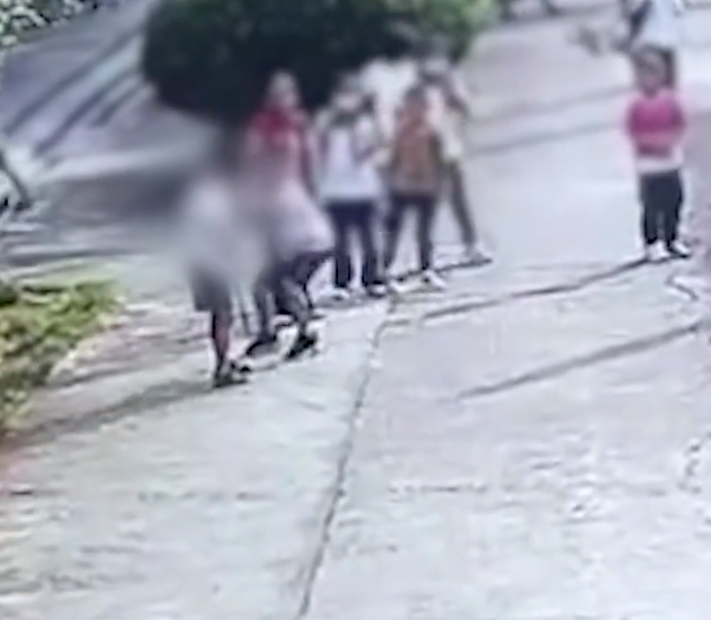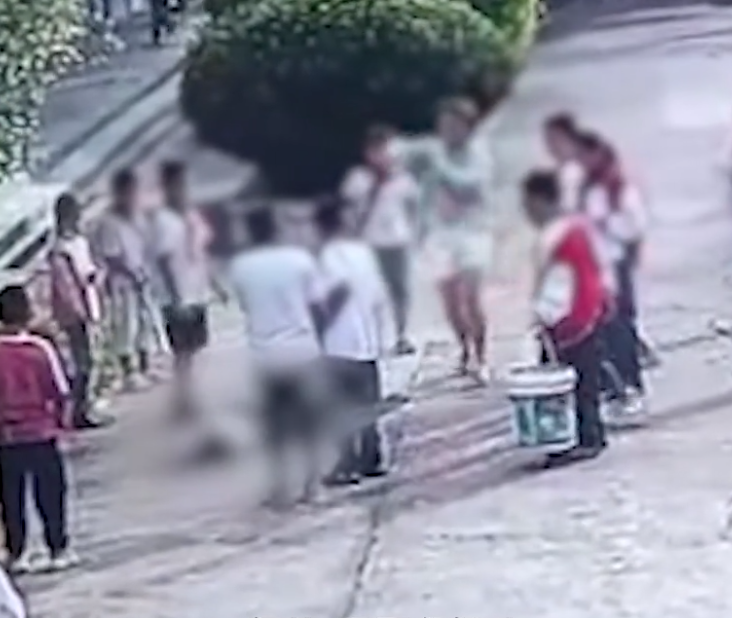 從監(jiān)控視頻中可以看到,事發(fā)時數(shù)名小學生正在操場上打掃衛(wèi)生,其中兩名小學生也不知道發(fā)生了什么矛盾(也許是在玩鬧?),一人手持火鉗悄悄靠近另一人,往其身上輕輕打了一下,真的就是輕輕打了一下,更像是挑釁行為。