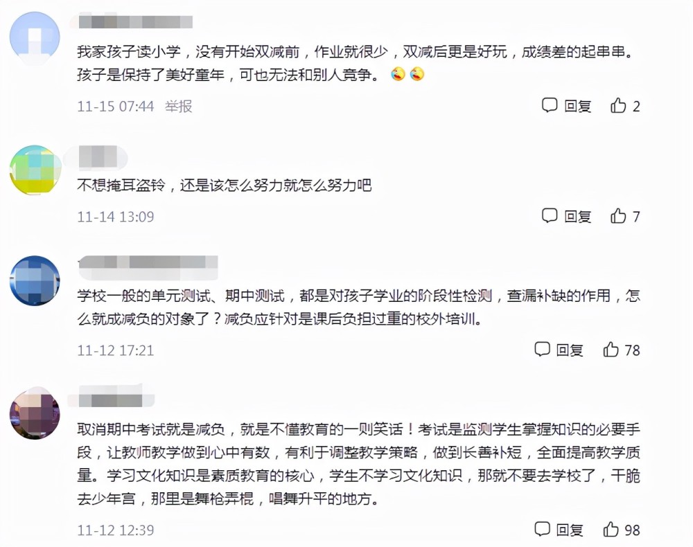 他們認(rèn)為國家在下發(fā)雙減政策前,一定做好了各方面的準(zhǔn)備。存在即合理,能做出這樣的決定,就會在以后有相應(yīng)的安排。一二年級主要還是以適應(yīng)為主,不考試可以理解。