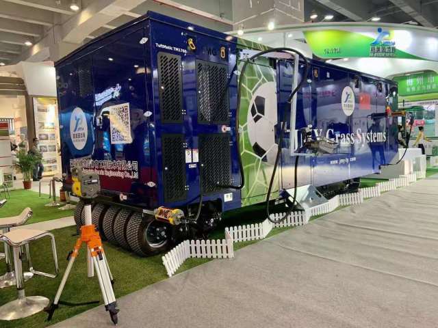 在本次廣東體博會上,深圳嘉美茵體育工程技術(shù)有限公司展位上的一輛深藍(lán)色長方形汽車格外惹人注目。從外部來看,這輛汽車看不到輪胎、座椅和方向盤,但仔細(xì)研究才發(fā)現(xiàn),這個名為“錨固型混植機(jī)JMY Grass Systems”的“汽車”可謂它大有玄機(jī)。