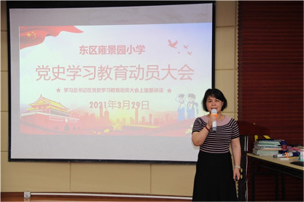 2021年3月29日下午,東區(qū)雍景園小學(xué)召開黨史學(xué)習(xí)教育動員大會,認真學(xué)習(xí)習(xí)近平總書記在黨史學(xué)習(xí)教育動員大會上的重要講話精神,傳達全市及東區(qū)街道黨史學(xué)習(xí)教育動員大會的內(nèi)容要求,部署開展黨史學(xué)習(xí)教育的相關(guān)工作。