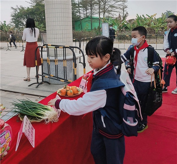 春山如笑,燕語鶯啼。2月22日早上,孩子們踏入校園,一眼望去的展臺上蘋果、橘子、綠蔥等喜氣盈盈,寓意滿滿。同學(xué)們在通紅的小道中接受了“平平安安”、“大吉大利”、“聰明伶俐”的祝福,迎接了新的希望。