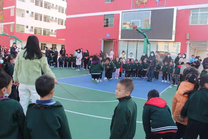 大課間活動中,孩子們排著整齊的隊伍安靜有序地走出教室,進入操場,伴著音樂的節(jié)奏整齊有力地完成了隊列隊形、國學操、跑步操和集體跳繩的展示。家長們手中的手機不時閃動,更有家長親自身融入到孩子們的活動中,和孩子們共同體驗體育鍛煉的健康和樂趣。