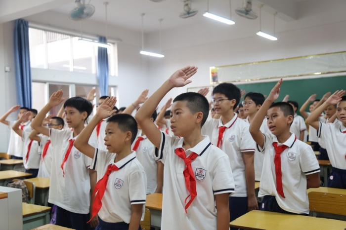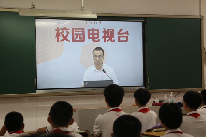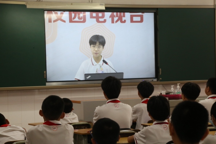 下午突降大雨,按照預(yù)案,全體師生留在教室。學(xué)校利用校園電視臺(tái),舉行了簡潔明快的開學(xué)禮。開學(xué)禮必不可少的儀式——展國旗高唱國歌順利進(jìn)行。在雄壯的國歌聲伴奏下,師生們注目大屏幕上的國旗,一起唱響了國歌。通過電視屏幕,同學(xué)們一一認(rèn)識(shí)了學(xué)校行政團(tuán)隊(duì)成員。