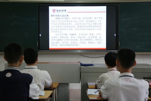 《中華人民共和國民法典》是一部社會生活百科全書,是人民民事權(quán)利的保障法典,分7編1260條,將于2021年1月1日起施行。為了讓東升中學(xué)全體師生學(xué)習(xí)了解《民法典》基本內(nèi)容,加強對廣大師生、特別是青少年的法制宣傳教育,7月8日上午,東升中學(xué)德育處利用校園電視臺在全校范圍內(nèi)開展了《民法典》學(xué)習(xí)宣傳活動。該活動由東升中學(xué)德育處黎國明副主任主講,在講座中,他還組織大家觀看《民法典宣傳片第十版》宣傳教育視頻。東升中學(xué)全體師生約有1500人參加該項活動。