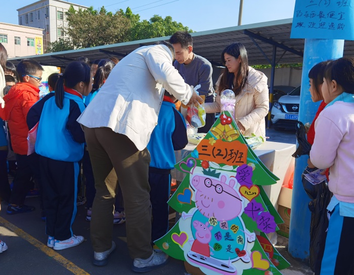 活動一開始,牛角小學(xué)每個班級的孩子們就迫不及待地開始布置自己班的攤位,拿出早已準(zhǔn)備好的商品,和精心設(shè)計的招牌。低年級的孩子在家長志愿者的幫助下,也開始了義賣。中高年級的孩子還設(shè)置了售貨員、促銷員、環(huán)保員、會計、保安員、統(tǒng)計員等分工合作,看著自己商品被人買走,臉上洋溢著快樂的笑容。一時間操場上叫賣聲此起彼伏,熱鬧非凡。老師、學(xué)生們目不暇接,在每個愛心小攤前流連忘返,挑選自己中意的物品。大家紛紛來捧場,慷慨解囊,用自己的實際行動支持本次愛心義賣活動。寒冬里,孩子們一個個溫馨的笑容,一聲聲熱情的叫賣,一份份精致的愛心……成為校園里一道道靚麗的風(fēng)景線。