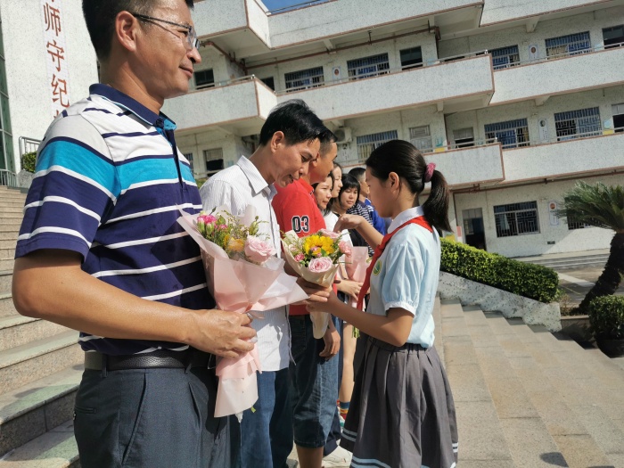 活動開始學(xué)生代表給老師們送上節(jié)日的頌詞,在主持人梁子柔老師的帶領(lǐng)下,少先隊員代表們向老師獻(xiàn)上美麗的花束,孩子們手捧著一束束精美的鮮花,滿懷感恩地在學(xué)校大梯前為全體老師鮮花。老師們接過鮮花,幸福的笑容綻放在臉上,他們必將在這片沃土上,收獲自己的繁花似錦。最后由全校同學(xué)向老師們送上節(jié)日祝福,“老師,節(jié)日快樂,您辛苦了”一聲聲甜脆入耳的問候使空氣里彌漫著感恩的溫情,幸福的味道。