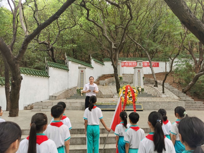 隨后,在豐聯(lián)小學(xué)少工委主任詹前秒和大隊(duì)輔導(dǎo)員林素涵的帶領(lǐng)下,全體黨員教師、全體少先隊(duì)隊(duì)干前往位于阜沙中學(xué)校內(nèi)的革命烈士陵園。奏唱國歌后,大隊(duì)輔導(dǎo)員林素涵向少先隊(duì)隊(duì)干們介紹了革命烈士的生平事跡,隨即少工委主任詹前秒校長與少先隊(duì)員們向革命烈士們獻(xiàn)上花束,并默哀一分鐘,以表達(dá)對(duì)革命烈士們深切悼念之情和崇高的敬意。