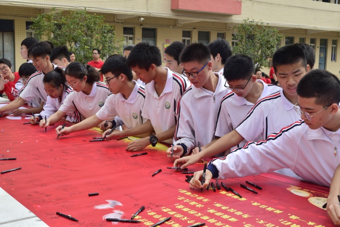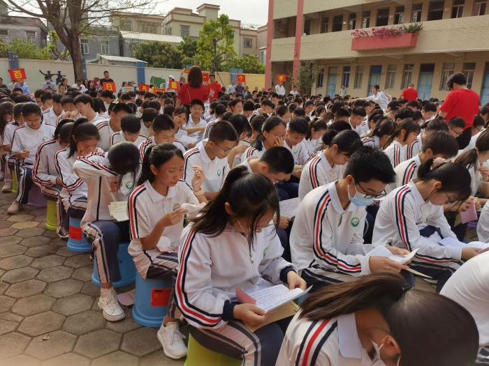 之后,一封來(lái)自父母精心準(zhǔn)備的信遞到每個(gè)初三學(xué)生的手中,看著父母的書信,學(xué)生們流下了感動(dòng)的熱淚,父母以最真摯無(wú)私的語(yǔ)言觸動(dòng)了學(xué)生們的心。港口鎮(zhèn)黨委委員羅希京也對(duì)初三學(xué)子提出希望:希望初三學(xué)生以考入名校的學(xué)長(zhǎng)學(xué)姐為榜樣,學(xué)習(xí)“苦心人,天不負(fù),臥薪嘗膽,三千越甲可吞吳”的精神,奮戰(zhàn)百天,蟾宮折桂。最后,全體初三學(xué)子莊嚴(yán)宣誓,并在奮戰(zhàn)百日奮戰(zhàn)書上簽名。